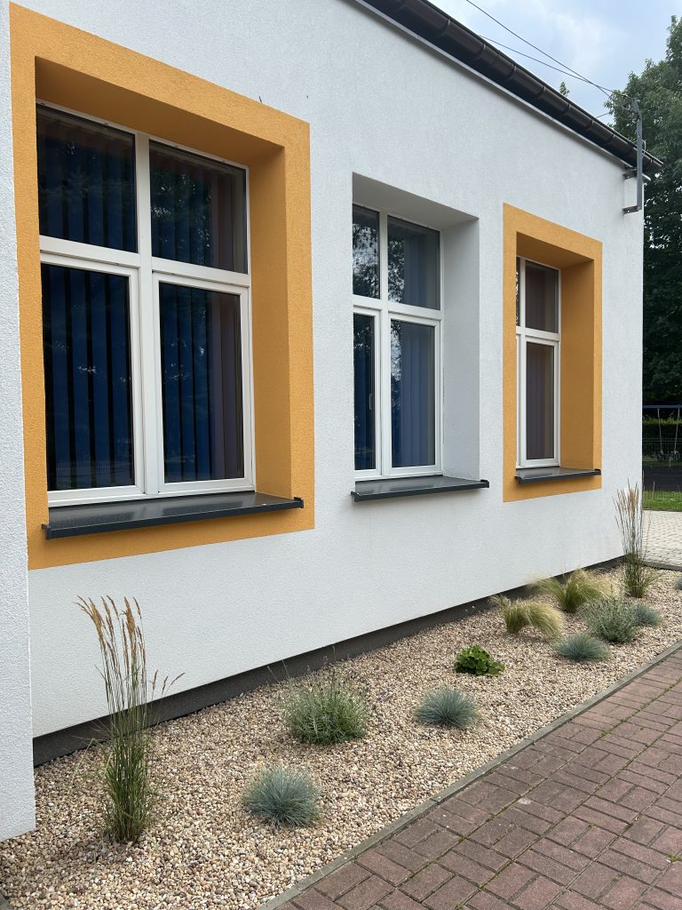Wiosną 2025r. przed budynkiem szkoły utworzono nowe, zielone rabaty